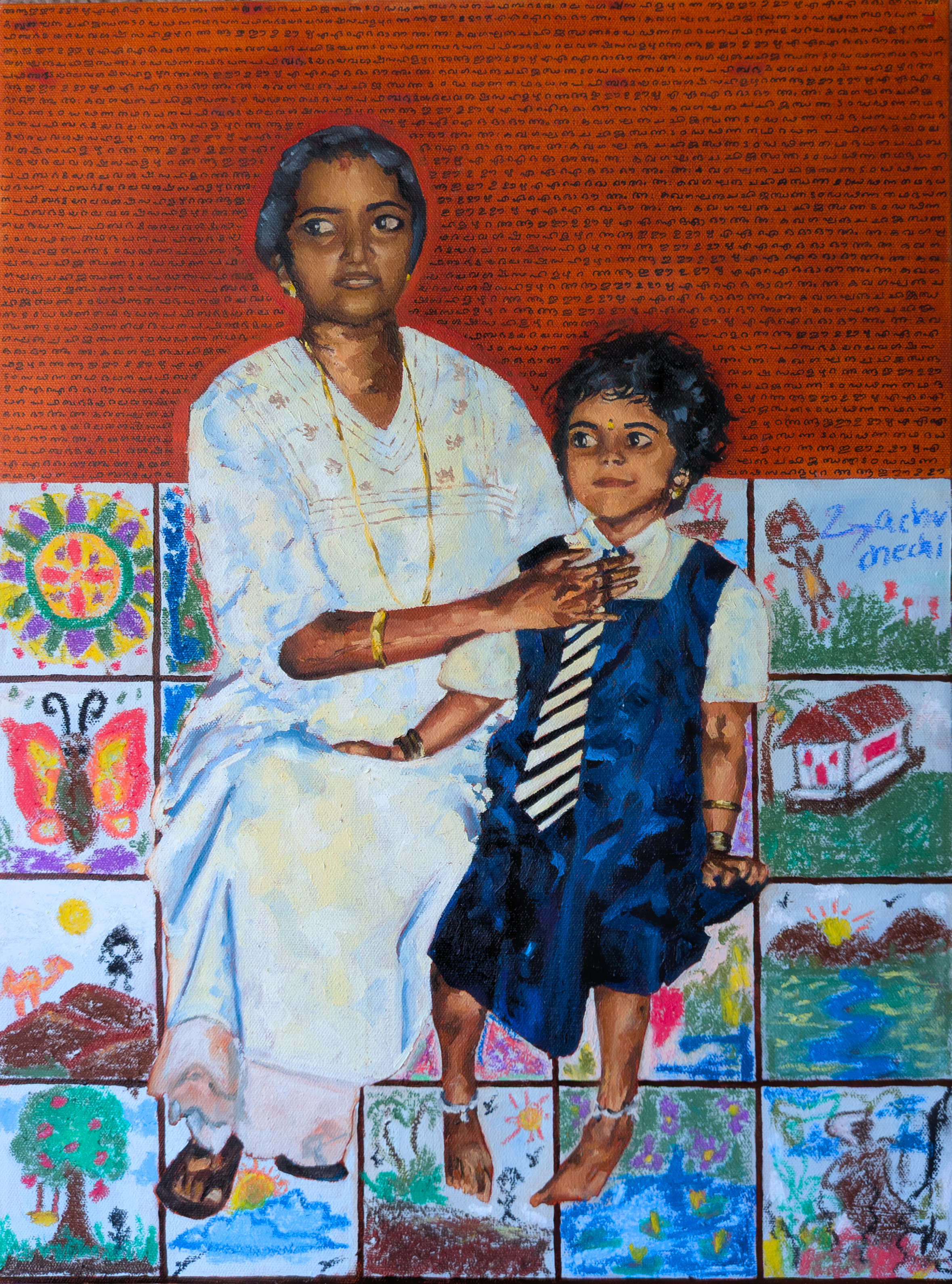 14'' x 11'', oil and Ink on Saree stretched over Canvas Panel